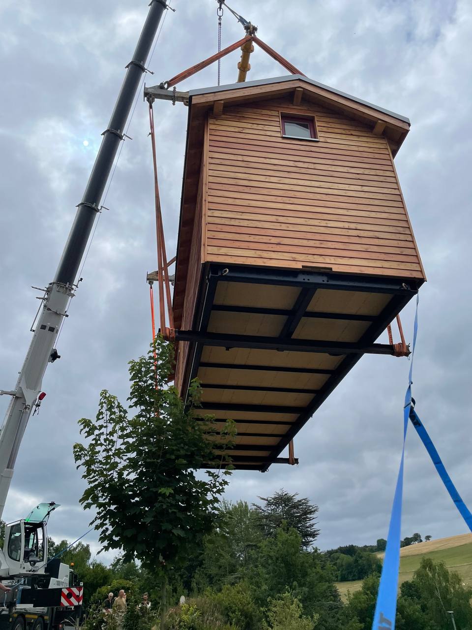 Beschreibung: Ein Haus wird als Ganzes angeliefert und mit einem Kran aufgestellt.