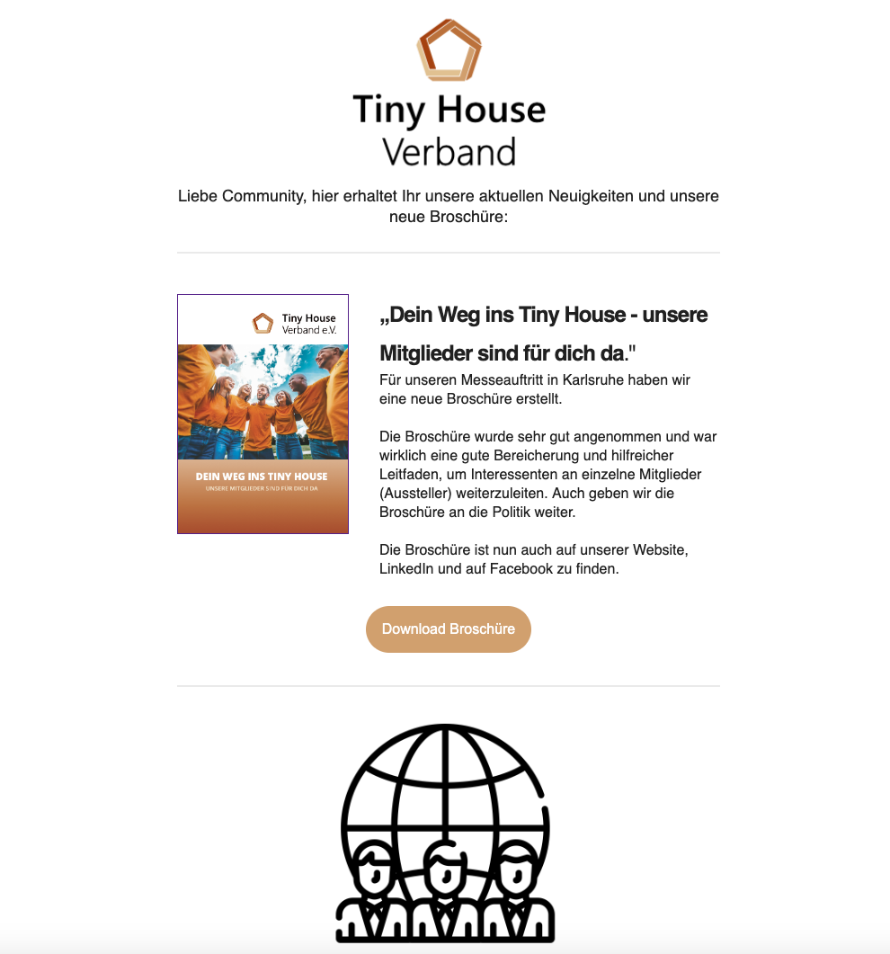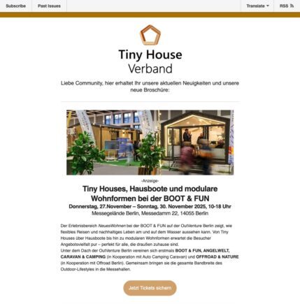 Wir informieren regelmäßig über die interessantesten und wichtigsten Aktivitäten vom Tiny House Verband (THV). Wir möchten Ihnen zeigen, mit welchem Engagement sich unsere Mitglieder, unser Team, die Repräsentanten sowie der Vorstand einsetzen, um die wirtschaftlichen und politischen Interessen des kleiner Wohnens zu vertreten und ganz allgemein eine Marktentwicklung hin zu einer nachhaltigen, emissionsarmen neuen Wohnform zu befördern, um diese zunehmend in der Gesellschaft zu verankern.